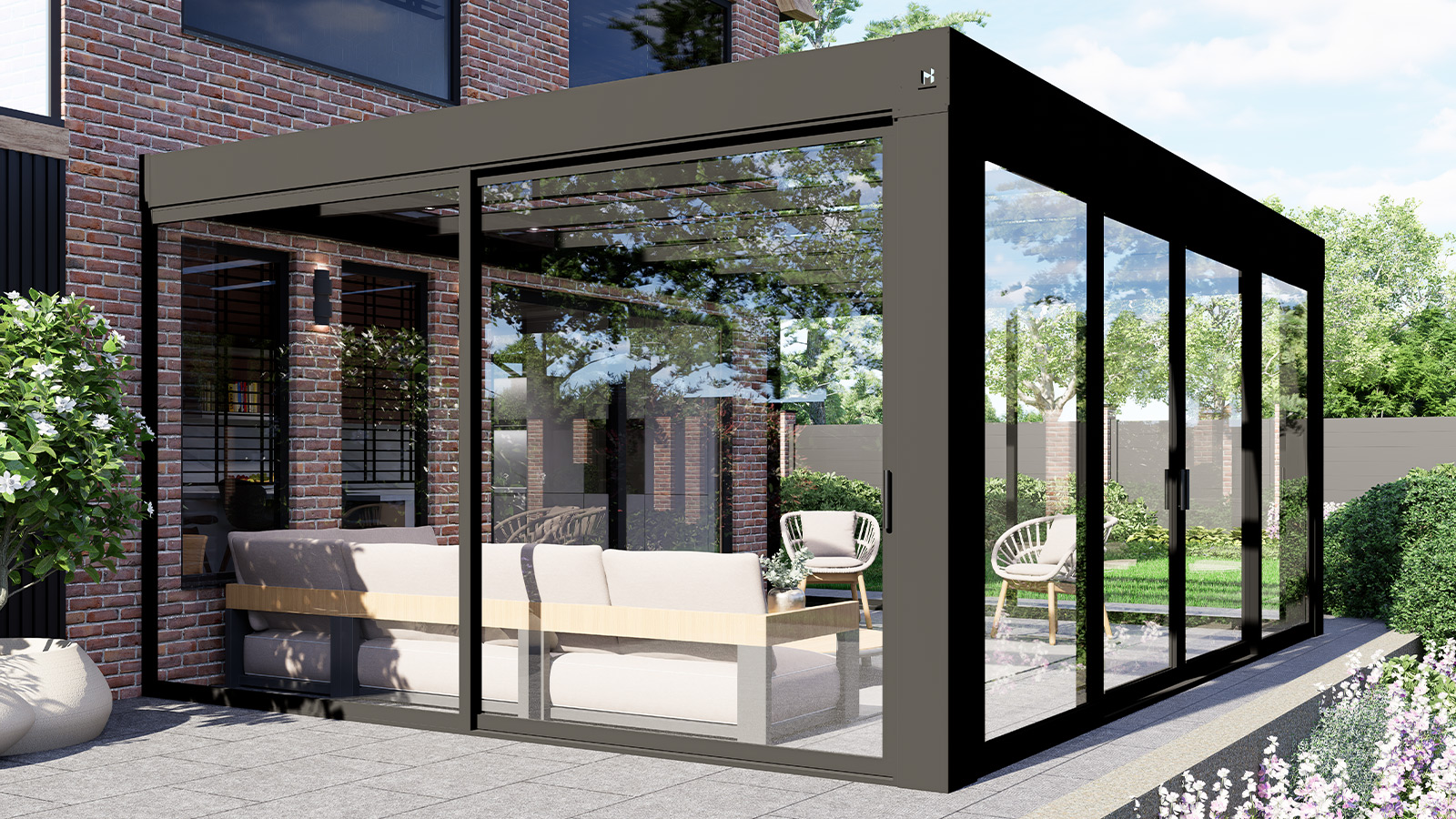 De MB Cube Grand tuinkamer is gebaseerd op de MB Cube Grand veranda, maar ontworpen als volwaardige afgesloten leefruimte. Door de toevoeging van glazen schuifwanden of een schuifpui aan de voor en zijkanten ontstaat een beschutte ruimte die u het hele jaar door kunt gebruiken.