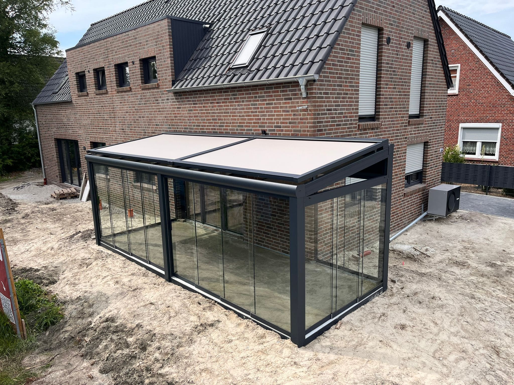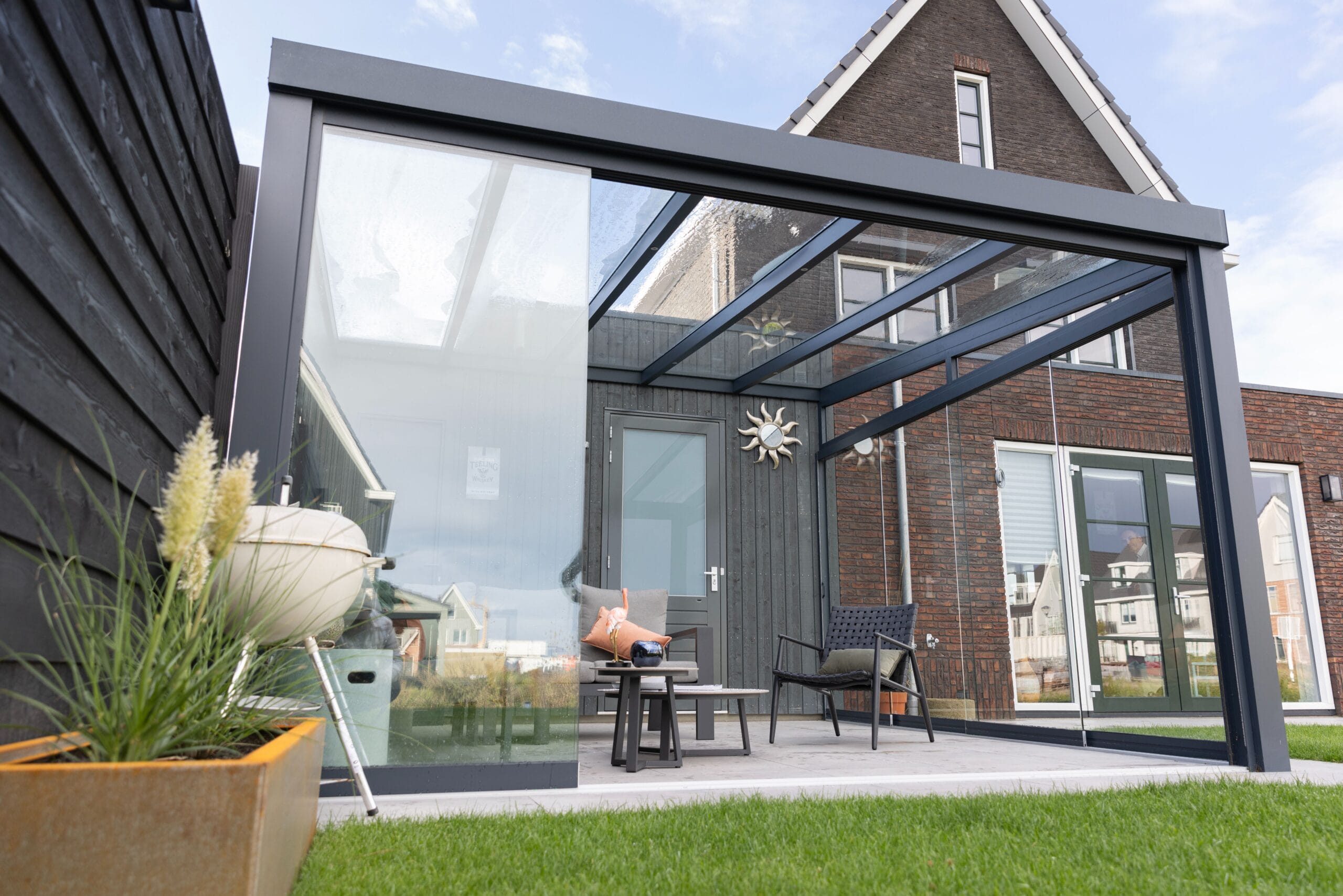 De MB Solid tuinkamer is ontwikkeld als afgesloten variant van de MB Solid veranda. Door de toevoeging van glazen schuifwanden of een schuifpui aan de voor en zijkanten ontstaat een beschutte ruimte die u het hele jaar door kunt gebruiken.